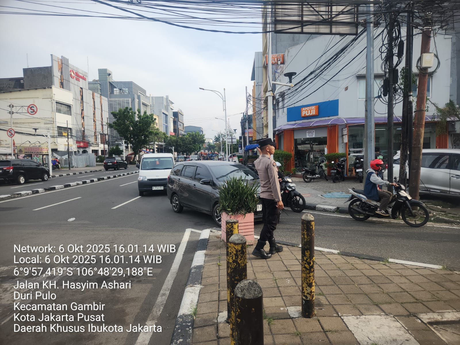 Jakarta Pusat – Senin sore, 6 Oktober 2025, suasana lalu lintas di kawasan Pertigaan Jalan Biak, Kelurahan Cideng, Kecamatan Gambir tampak tertib dan terkendali. Di tengah padatnya arus kendaraan yang mulai meningkat menjelang jam pulang kerja, tampak Aipda Zaenal Arifin, anggota Polsubsektor Roxy Polsek Metro Gambir, berdiri tegas di bawah teriknya matahari sore. Dengan gerakan tangan yang teratur, ia mengatur laju kendaraan agar tidak terjadi penumpukan di simpang jalan tersebut.