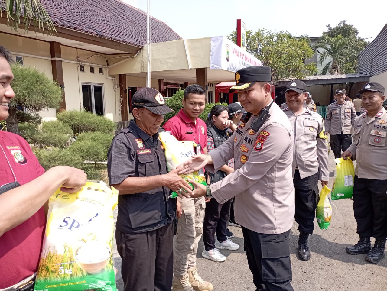 Usai apel, kegiatan dilanjutkan dengan pembagian beras SPHP kepada seluruh perangkat Potmas sebagai bentuk apresiasi atas dedikasi mereka yang selama ini aktif membantu menjaga keamanan dan ketertiban di lingkungannya masing-masing. Suasana hangat penuh keakraban tampak mewarnai kegiatan, mencerminkan semangat gotong royong dan persatuan antara aparat kepolisian dan masyarakat.