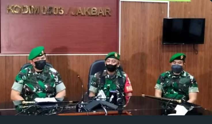 yang di dampingi Dandim 0503/JB, Letkol kav I Made Maha Yudhiksa, S. Sos dan Pelda M Jaelani menjelaskan kronologis terkait Pelda M Jaelani dalam membekuk pelaku penusukan bersama satjamnya.