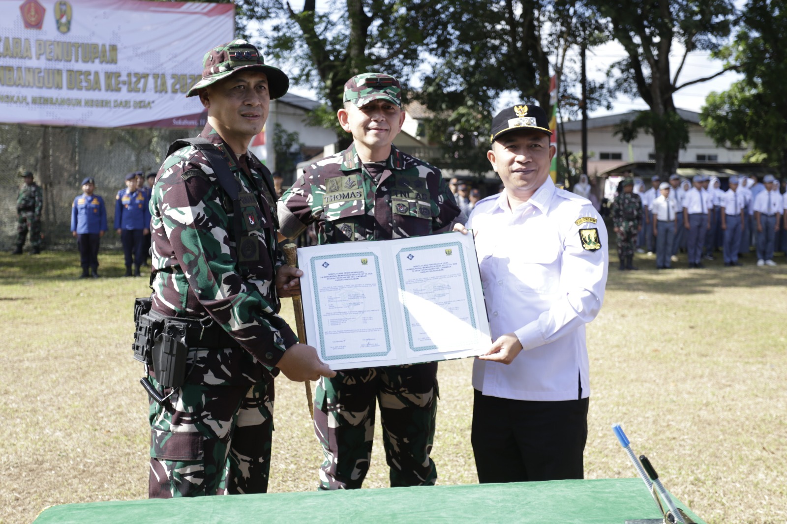 Program TNI Manunggal Membangun Desa (TMMD) Ke-127 yang dilaksanakan oleh Kodim 0607/Kota Sukabumi resmi ditutup oleh Danrem 061/Suryakancana Brigjen TNI Thomas Rajunio, S.I., B.S., M.Tr. (Han.) pada pukul 09.45 WIB. Kegiatan penutupan dilaksanakan di Lapangan Sepak Bola Perumnas Parakanlima Indah RT 003 RW 10, Desa Kertaraharja, Kecamatan Cikembar, Kabupaten Sukabumi, Jawa Barat.(Rabu,11/03/2026)