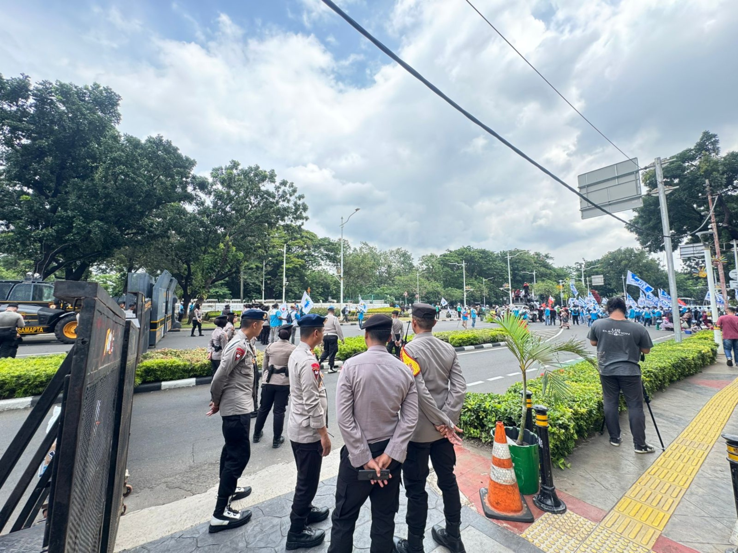 Jakarta — Brimob Polda Metro Jaya memberikan pelayanan kepada massa penyampaian aspirasi yang dilaksanakan oleh Pengurus Daerah Konfederasi Serikat Pekerja Indonesia (PERDA KSPI) Provinsi Jawa Barat di kawasan Silang Selatan Monas dan Sapta Pesona, Jakarta Pusat, Selasa (30/12/2025).