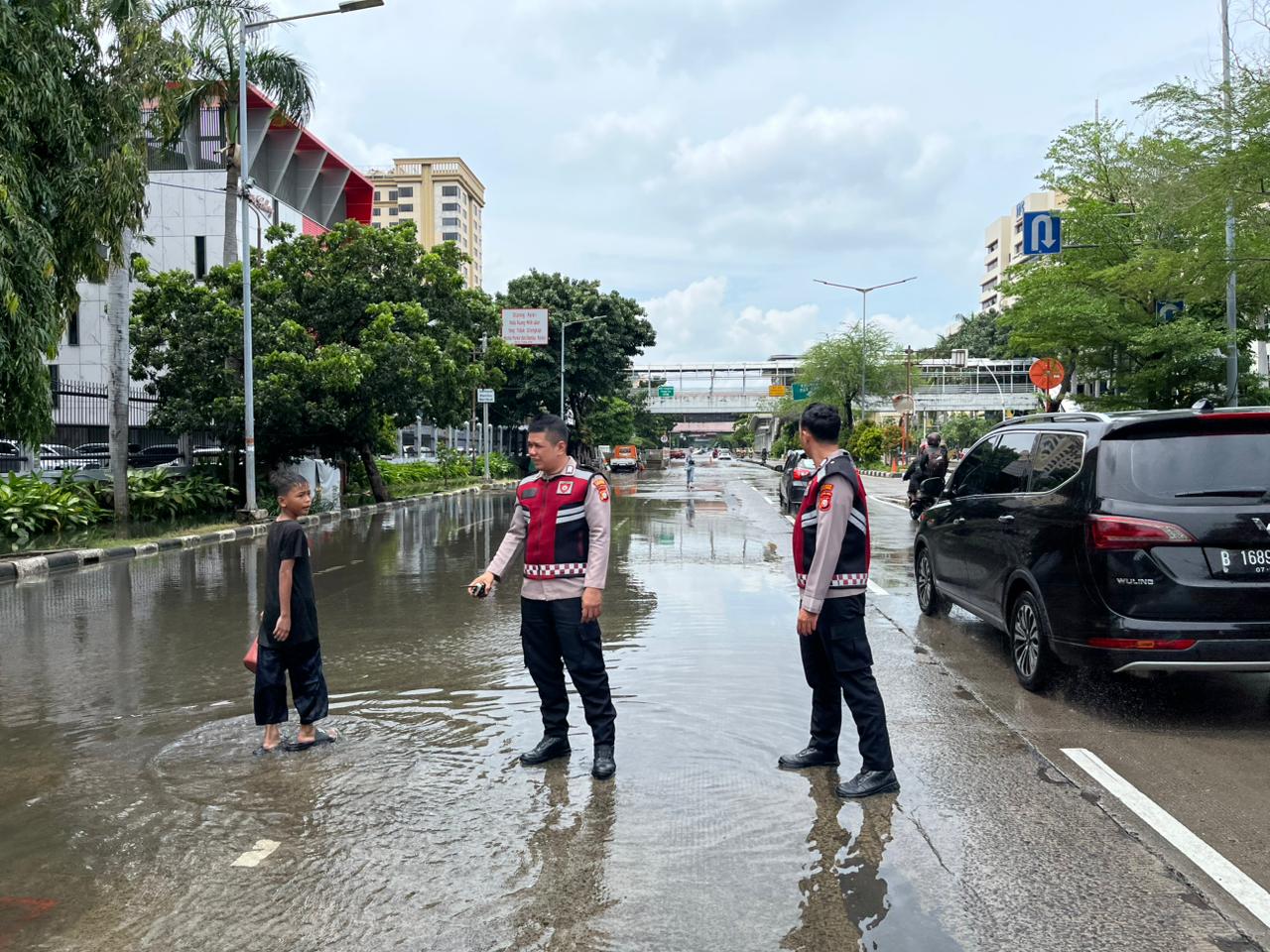 Pengecekan dilakukan di ruas Jalan Mangga Dua Raya yang sempat tergenang air usai hujan. Dalam semangat Polri peduli lingkungan warga, petugas melakukan pengaturan dan pengalihan arus lalu lintas sementara karena genangan masih menutup sebagian badan jalan dan hanya dapat dilalui kendaraan roda dua. Selain itu, petugas juga melakukan pengawasan terhadap anak-anak yang bermain di sekitar lokasi agar tidak membahayakan keselamatan. Hadir dalam kegiatan tersebut Brigadir Sandi Setiawan dan Brigadir Fahri, sehingga situasi kamtibmas tetap terjaga aman dan tertib.