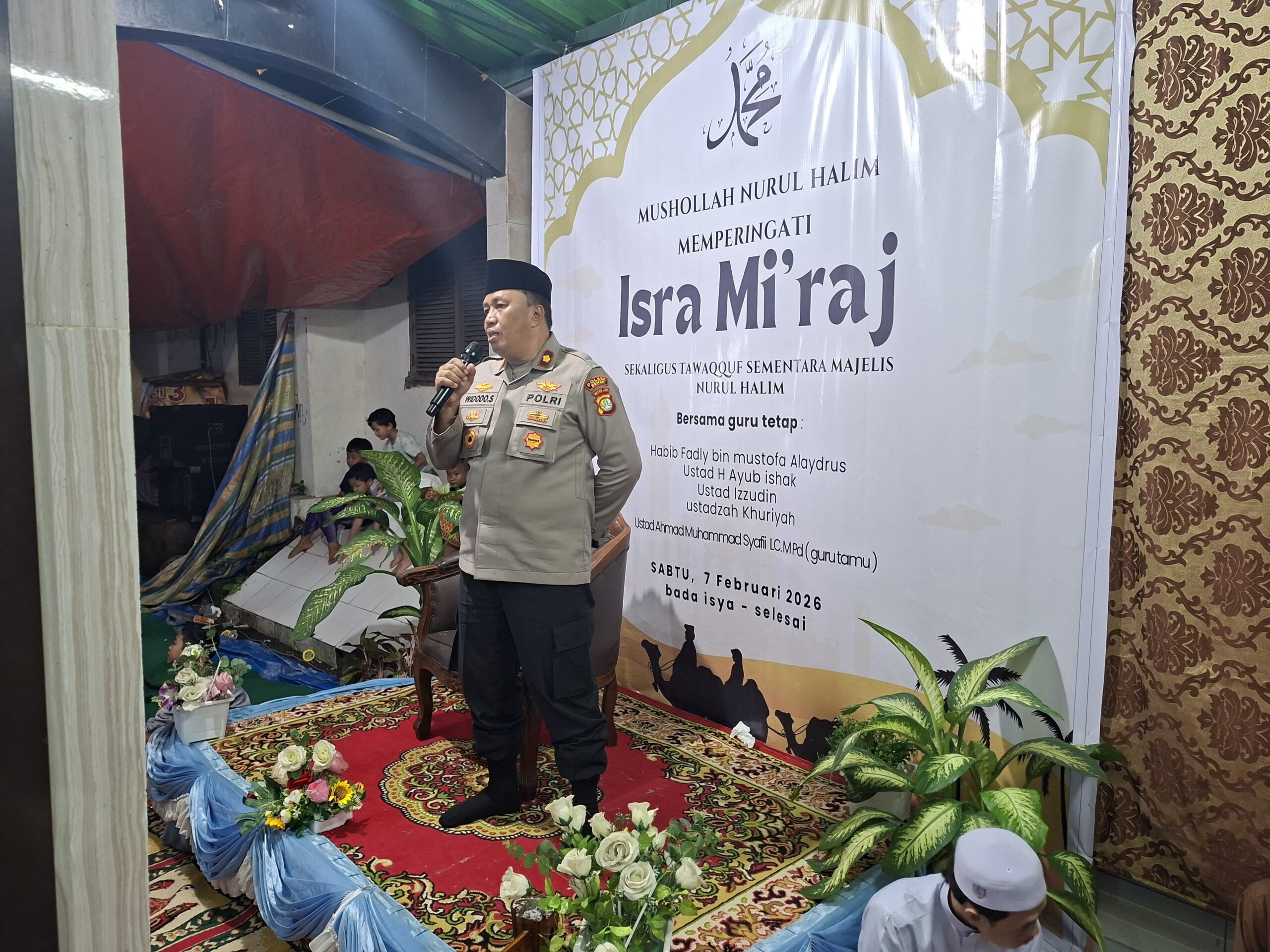 Jakarta Pusat – Kapolsek Senen Kompol Widodo Saputro, SH., MH menghadiri kegiatan peringatan Isra Mi’raj Nabi Muhammad SAW yang dirangkaikan dengan santunan anak yatim serta dalam rangka menyambut datangnya bulan suci Ramadhan. Kegiatan tersebut berlangsung di Mushola Nurul Halim, Jalan Kenari I RT 12 RW 03, Kelurahan Kenari, Kecamatan Senen, Jakarta Pusat, Sabtu (7/2/2026) malam.