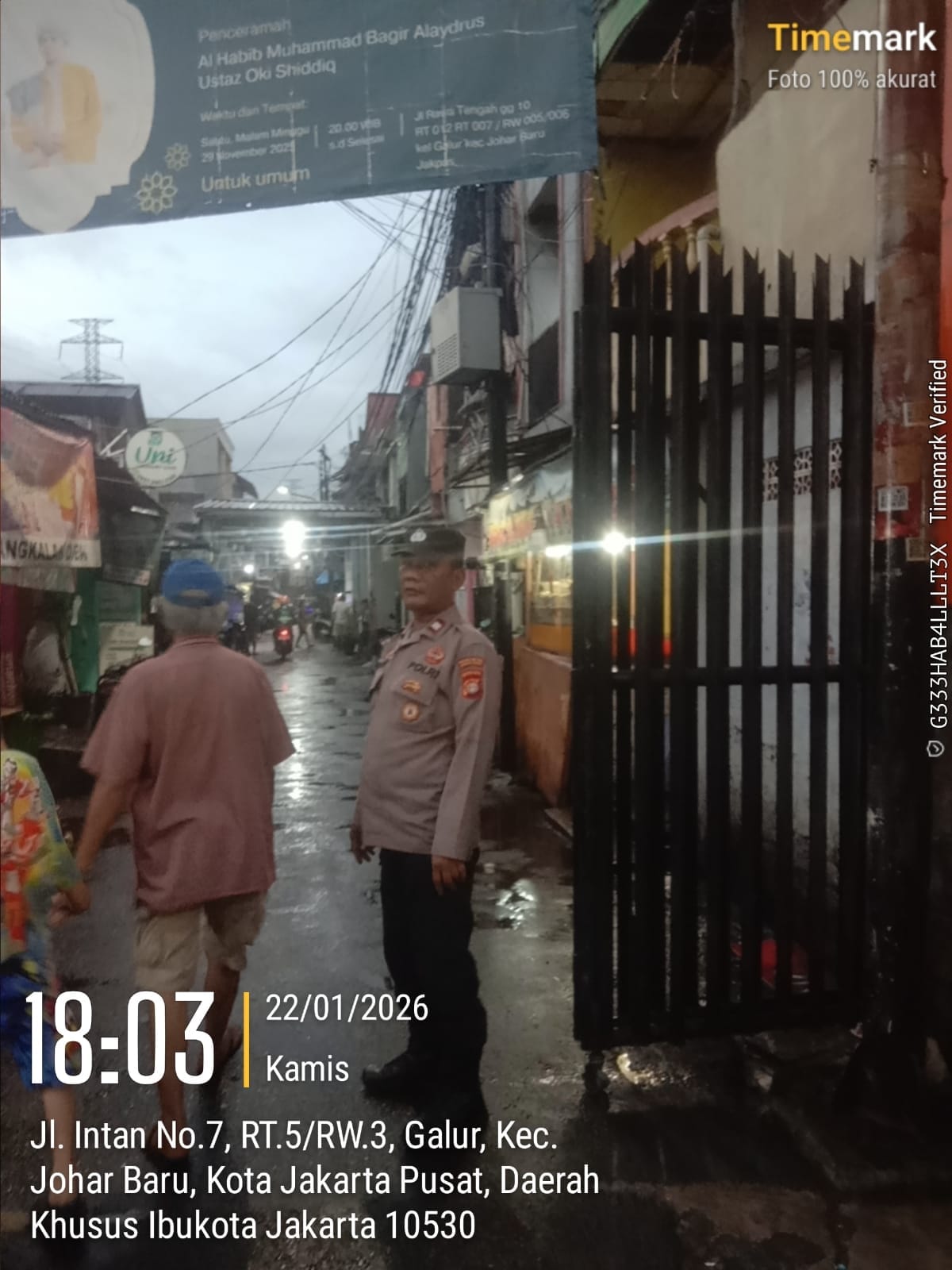 Jakarta Pusat — Jajaran Polsek Johar Baru terus meningkatkan kesiapsiagaan dalam menghadapi cuaca hujan guna memastikan keamanan dan kenyamanan masyarakat. Pada Kamis (22/1/2026) pukul 18.00 WIB, Kapolsubsektor Galur, Aiptu Zulfikar Hasibuan, melaksanakan monitoring situasi dan kondisi wilayah Kelurahan Galur, Kecamatan Johar Baru, Jakarta Pusat.