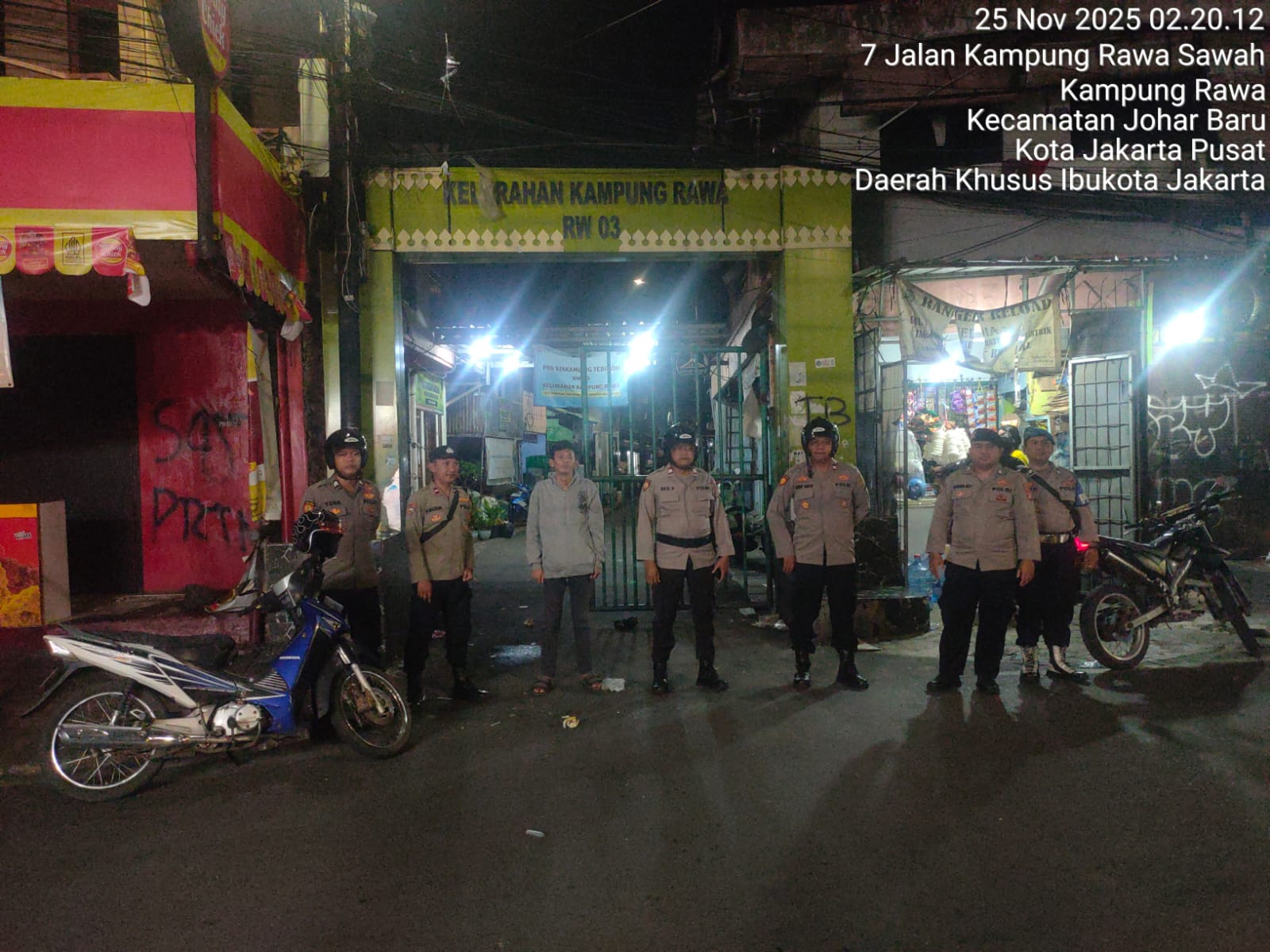 Jakarta Pusat – Dalam rangka menjaga keamanan dan ketertiban di wilayah Johar Baru, Polsek Johar Baru melaksanakan Patroli Antisipasi Guantibmas pada Selasa (25/11/2025) pukul 02.13 WIB. Apel dipimpin Aipda Tangguh Yudho P., diikuti 10 personel Polsek Johar Baru.