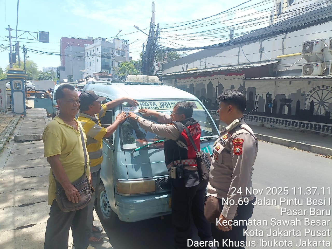 Jakarta Pusat — Panit Samapta Polsek Sawah Besar Aiptu Toni Susanto bersama Bripda Chandra menggelar patroli kewilayahan dan sosialisasi serta penempelan Barcode Patroli Sahabat Polisi di sepanjang Jalan Kartini Raya Kelurahan Kartini, Sawah Besar. Tepatnya di mobil angkutan umum rite di Sawah Besar dan sekitarnya Dalam kegiatan ini, Aiptu Toni memberikan penekanan pentingnya layanan cepat Polri melalui Patroli Presisi Jaga Jakarta serta pemanfaatan Layanan Polisi 110 untuk mengantisipasi gangguan keamanan, khususnya di angkutan umum. Senin (24/11/2025) pukul 11.30 WIB,