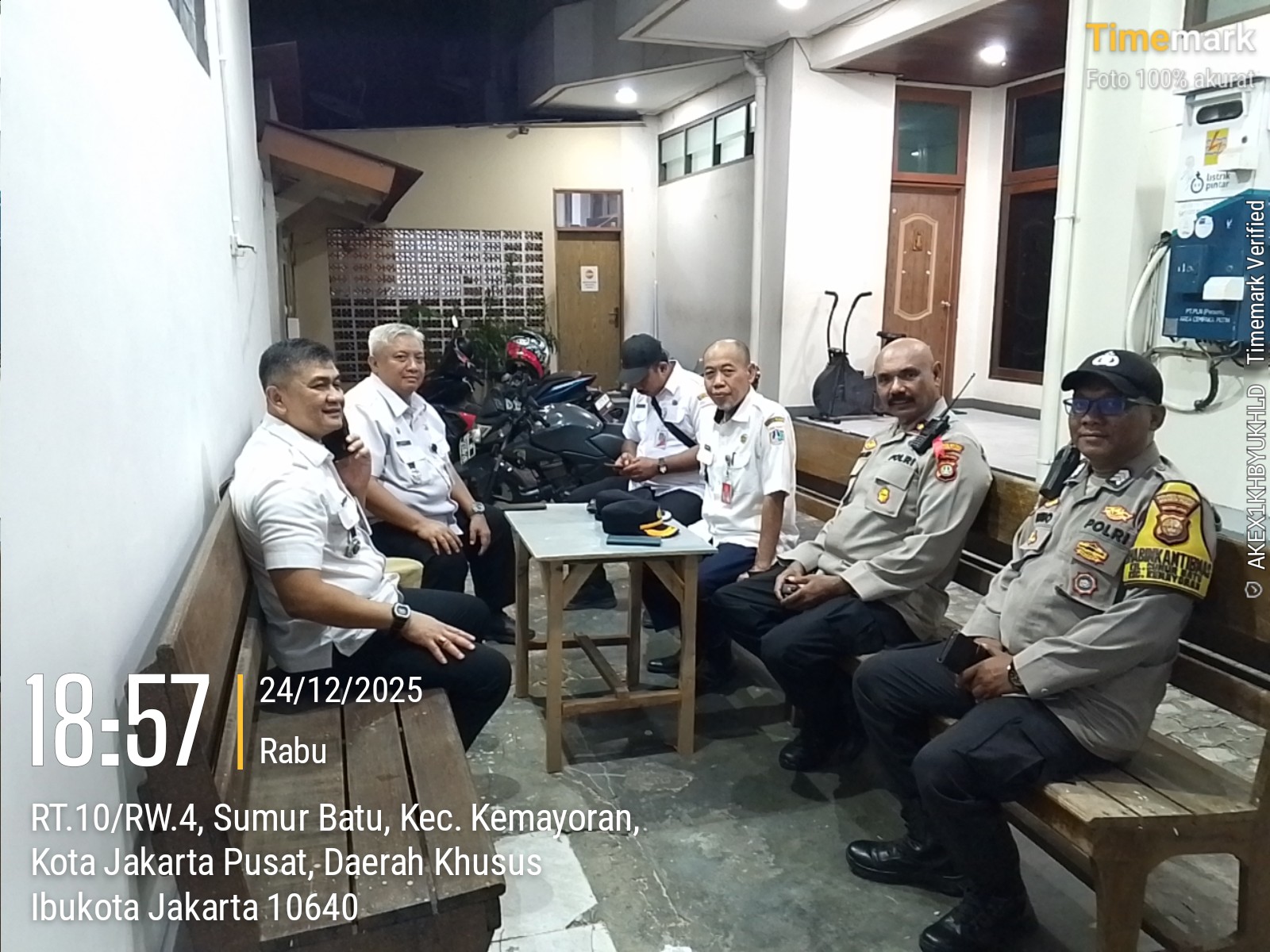 Pengamanan yang berlangsung sejak pukul 18.00 WIB hingga 20.30 WIB tersebut dipimpin langsung oleh Kapolsek Kemayoran Kompol Zakaria, S.H., M.H., bersama Bhabinkamtibmas Kelurahan Sumur Batu Brigpol Witno serta Bhabinkamtibmas Kelurahan Kebon Kosong Brigpol Yayat Ruhiyat. Kegiatan ini turut melibatkan unsur 3 Pilar dan instansi terkait sebagai wujud sinergi menjaga keamanan dan ketertiban masyarakat.