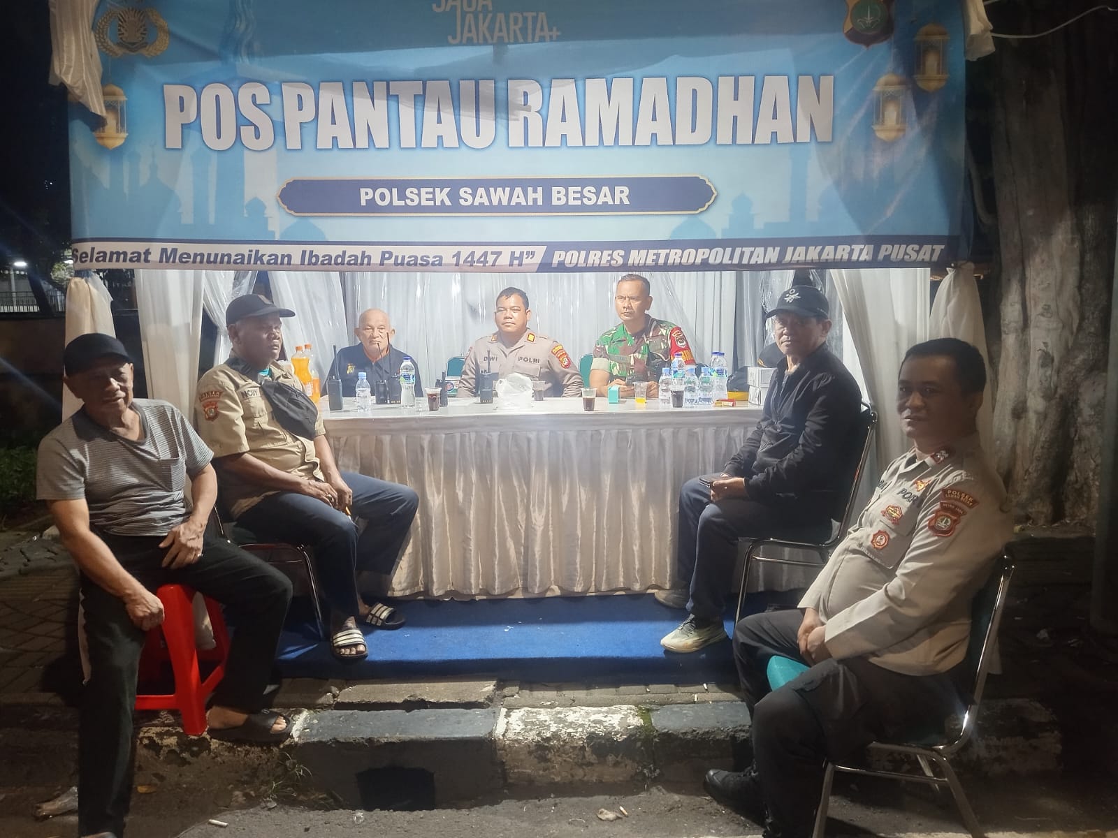 Jakarta Pusat — Polsek Sawah Besar bersama Pokdar Kamtibmas melaksanakan penjagaan Pos Pantau Ramadan 1447 H di kawasan Dobrak Jl. Gunung Sahari Raya, Pasar Baru, Sawah Besar, Jakarta Pusat, Senin (23/2/2026) pukul 22.00 WIB. Kegiatan dipimpin Kanit Binmas AKP Dwi Budianto, SH dengan tujuan mengantisipasi tawuran, petasan, serta gangguan kamtibmas menjelang waktu sahur selama bulan Ramadhan.