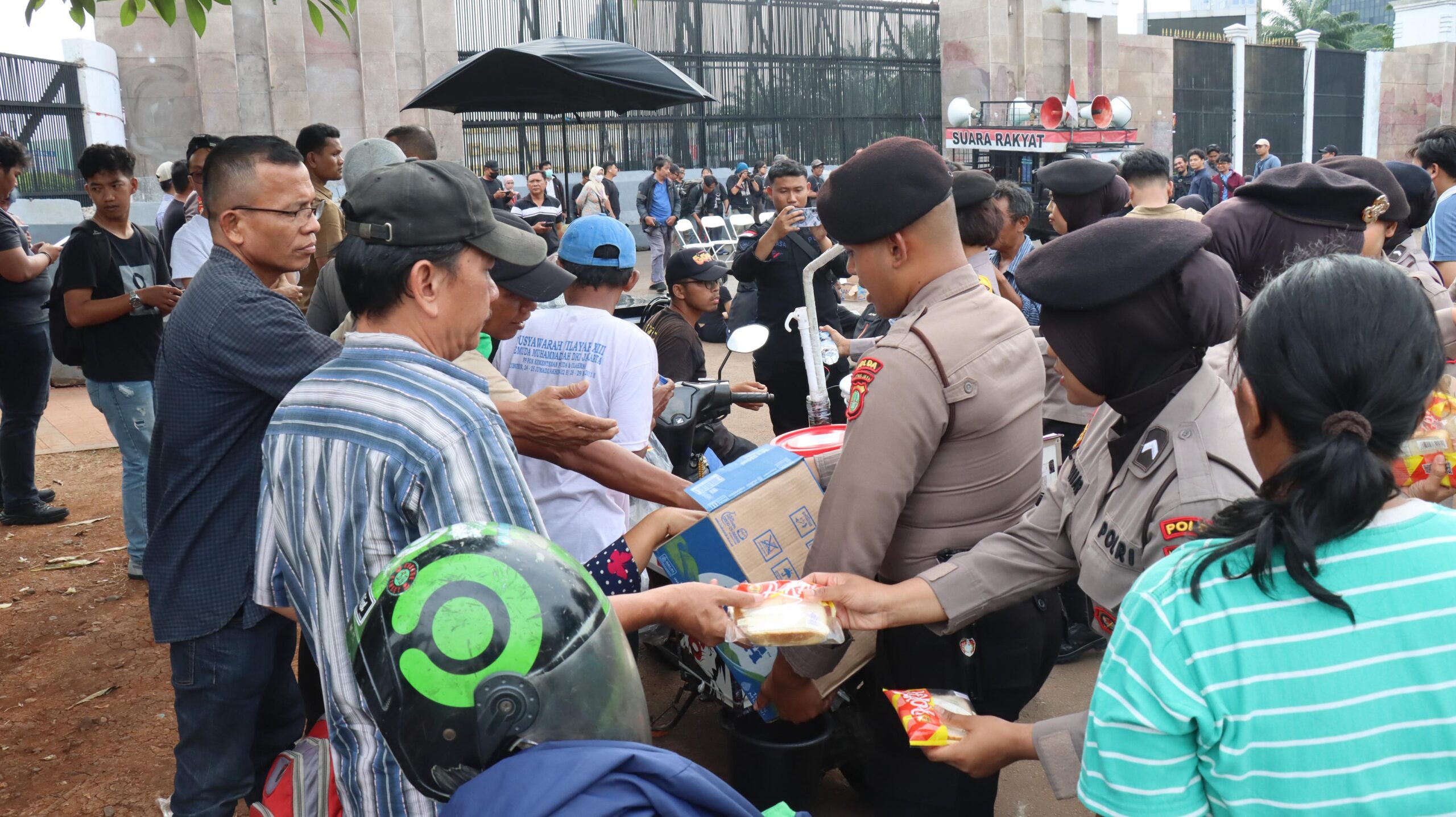 Polisi Bagikan Air dan Roti untuk Massa Aksi di Depan Gedung DPR