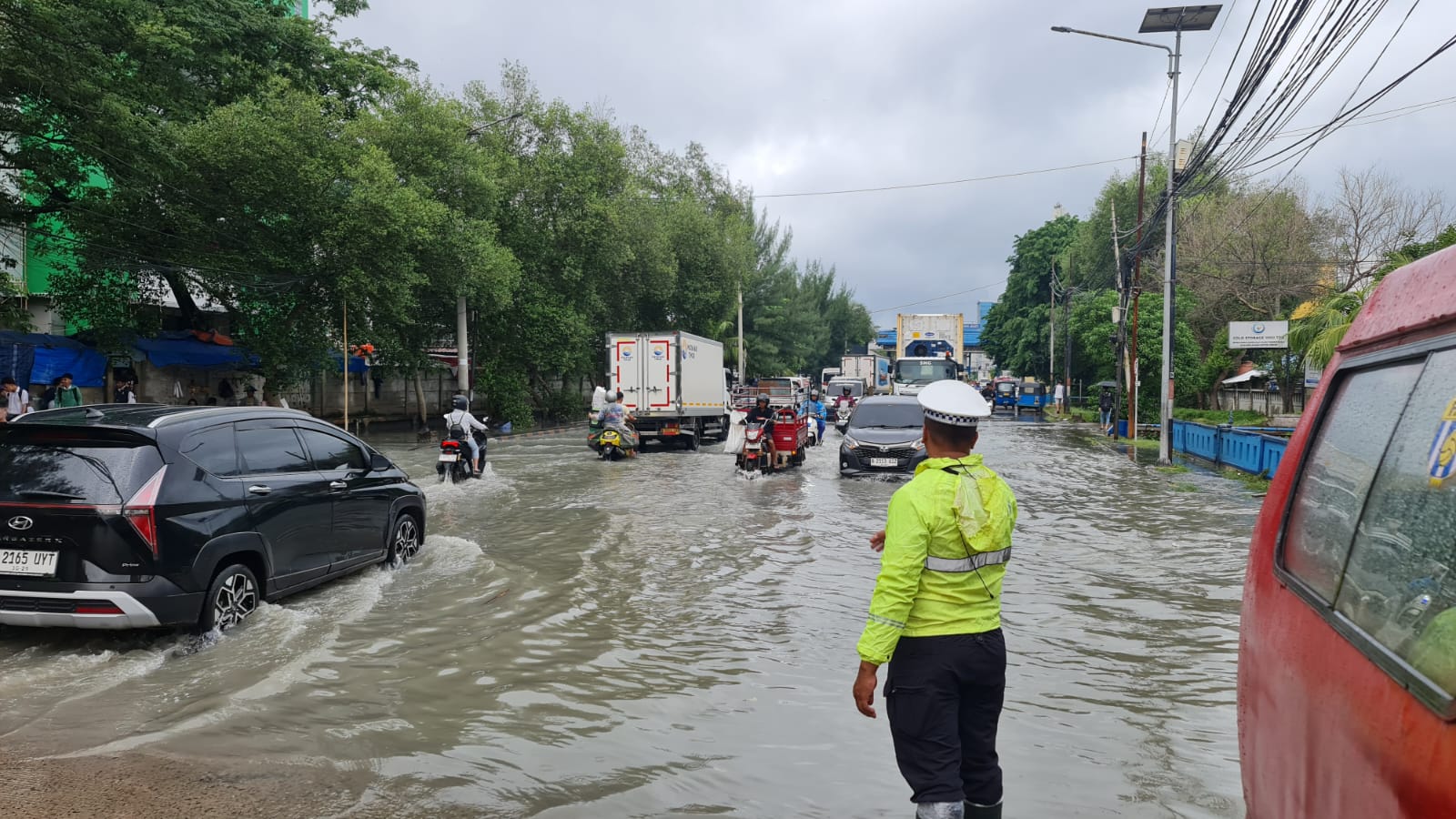 Polsek Kawasan Muara Baru, Polres Pelabuhan Tanjung Priok, Polda Metro Jaya melaksanakan pelayanan serta memberikan bantuan kepada masyarakat yang mengalami kendala saat melintasi genangan air rob dan hujan di wilayah Pelabuhan Muara Baru, Selasa (13/01/2026).