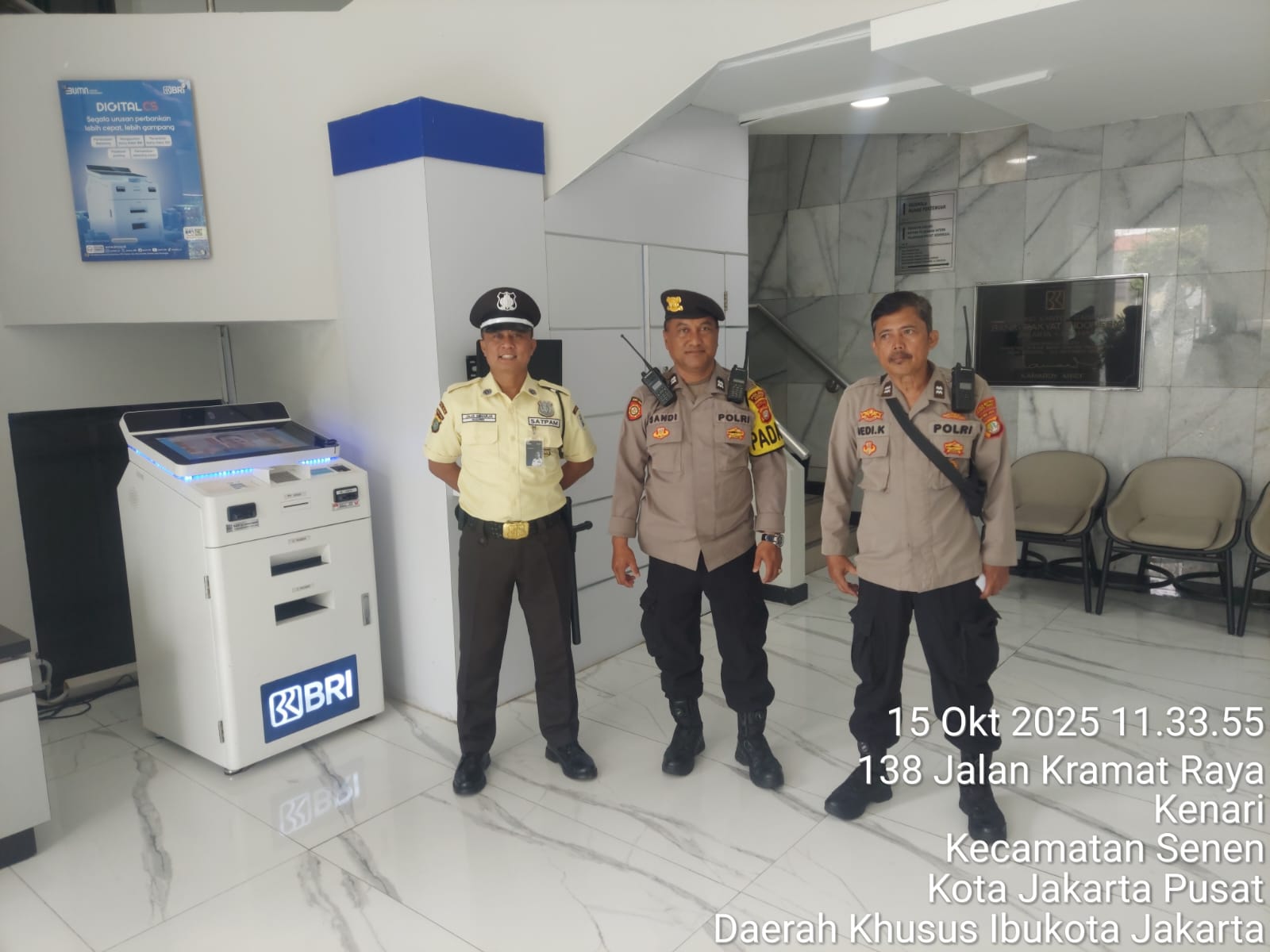 Jakarta — Dalam upaya menjaga situasi keamanan dan ketertiban masyarakat (Kamtibmas), personel Polsek Senen melaksanakan patroli mobile menyasar kawasan perbankan di wilayah Kecamatan Senen, Jakarta Pusat, Rabu (15/10/2025).