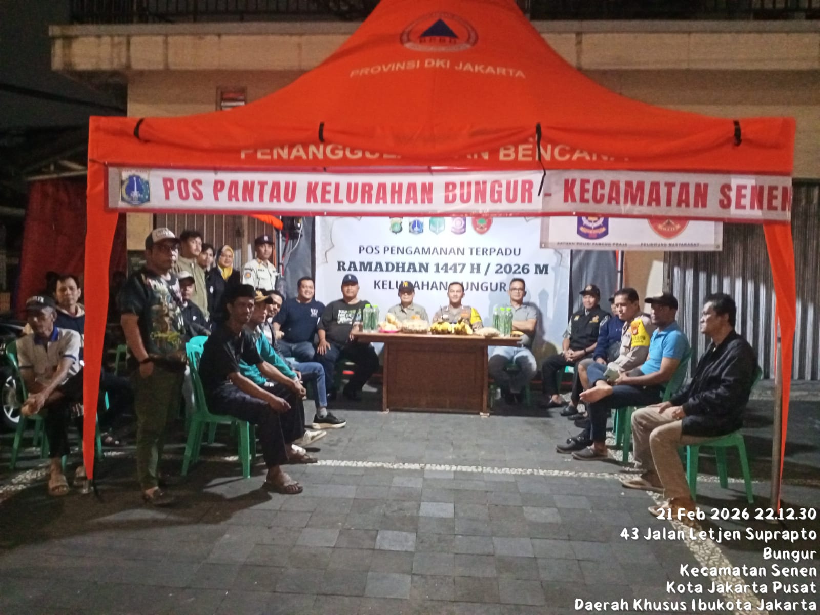 Petugas gabungan menggelar kegiatan Pos Pantau Pengamanan Ramadan 1447 H/2026 M di Jalan Letjend Suprapto, Kelurahan Bungur, Kecamatan Senen, Jakarta Pusat, pada Sabtu (21/2/2026) pukul 22.00 WIB. Kegiatan ini dilakukan untuk mengantisipasi potensi gangguan keamanan dan ketertiban masyarakat (kamtibmas), terutama setelah salat tarawih, menjelang sahur, hingga setelah waktu makan sahur.