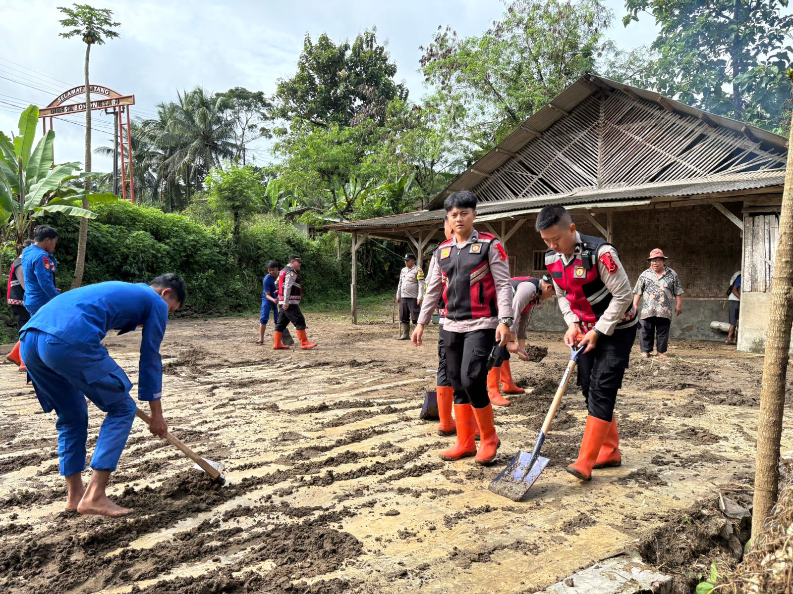 Personel Satuan Samapta Polres Sukabumi bergerak cepat melakukan pembersihan material banjir dan longsor yang terjadi di wilayah Kecamatan Nyalindung, Kabupaten Sukabumi, akibat hujan deras yang mengguyur kawasan tersebut.