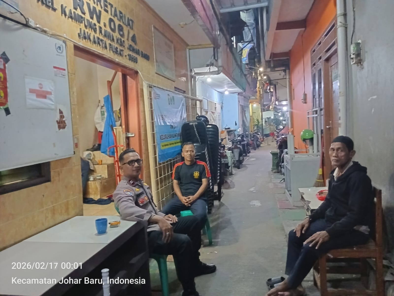 Jakarta Pusat – Guna menjaga stabilitas keamanan wilayah pada jam rawan, Bhabinkamtibmas Kelurahan Kampung Rawa melaksanakan patroli wilayah dan kunjungan ke Pos Siskamling RW 06, Selasa dini hari (17/2/2026) pukul 00.01 WIB.