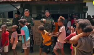 Tambraw – Satgas Pamtas RI-PNG Kewilayahan Yonif 763/SBA Pos Yembun berbagi kebahagian bersama masyarakat dengan memberikan makanan kepada masyarakat setempat