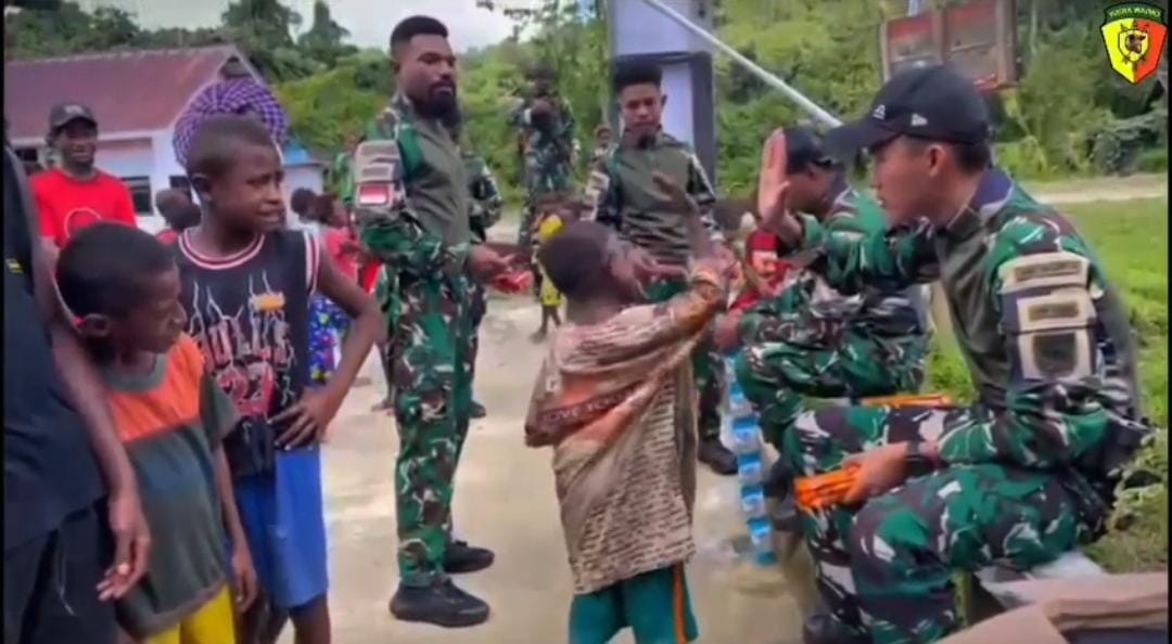 Tambraw – Satgas Pamtas RI-PNG Kewilayahan Yonif 763/SBA Pos Yembun berbagi kebahagian bersama masyarakat dengan memberikan makanan kepada masyarakat setempat