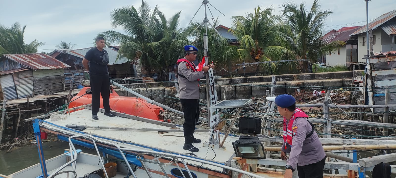 Satuan Polair Polres Beltim Laksanakan kegiatan pembagian Bendera Merah Putih kepada masyarakat pesisir di pelabuhan tradisional Manggar pada hari Senin 11 Agustus 2025, dalam rangka menyambut HUT RI ke-80 Tahun 2025.