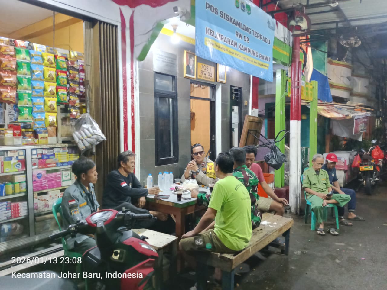 Jakarta Pusat – Upaya menjaga keamanan lingkungan terus diperkuat melalui sinergi aparat kewilayahan. Bhabinkamtibmas Kelurahan Kampung Rawa bersama Babinsa melaksanakan patroli wilayah sekaligus kunjungan ke Pos Siskamling RW 02 Kelurahan Kampung Rawa, Kecamatan Johar Baru, Jakarta Pusat, Selasa (13/1/2026) malam.