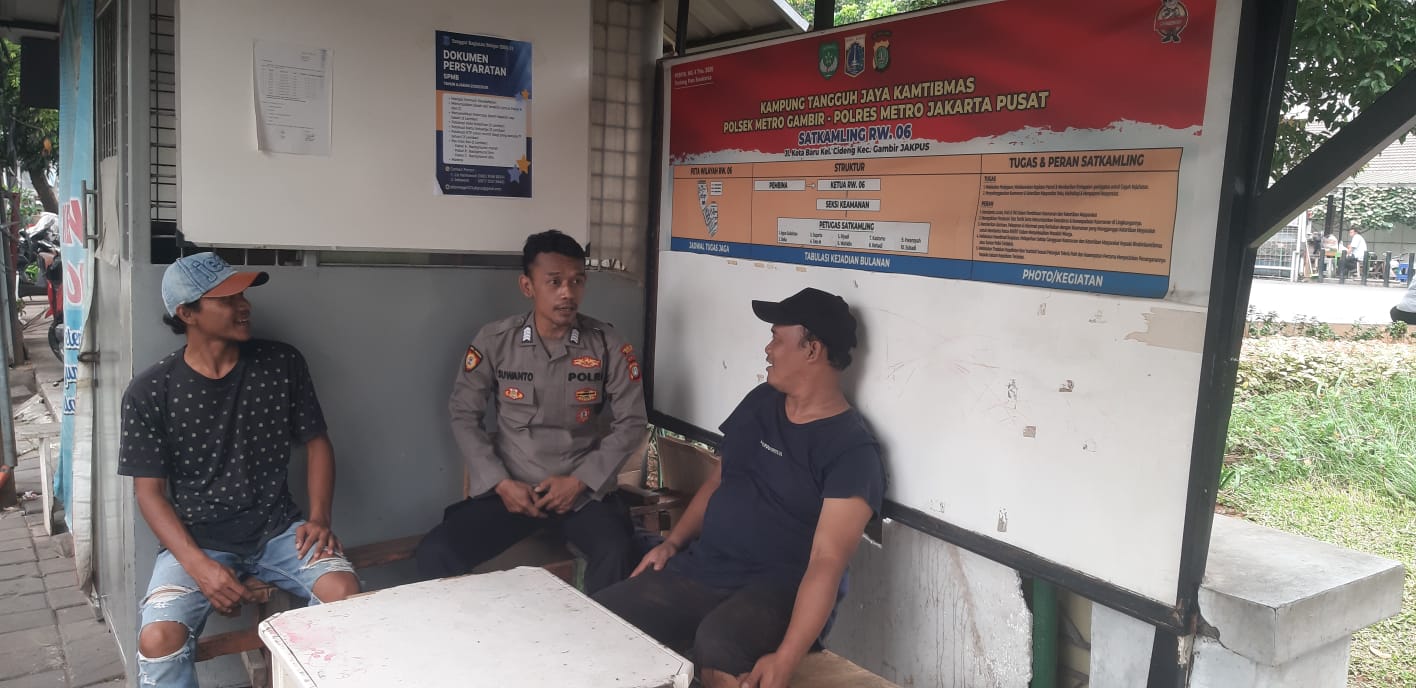 Jakarta Pusat — Senin, 6 Oktober 2025, personel Unit Sabhara Patko 1012 Polsek Metro Gambir melaksanakan kegiatan patroli strong point dan sambang kewilayahan di sekitar Pos Keamanan RW.06 Kelurahan Cideng, Kecamatan Gambir. Kegiatan ini merupakan bagian dari upaya berkelanjutan Polsek Metro Gambir dalam menjaga stabilitas kamtibmas, terutama untuk mengantisipasi kejahatan jalanan serta potensi tindak 3C (curat, curas, curanmor).